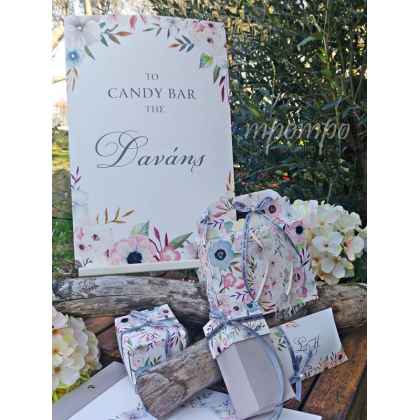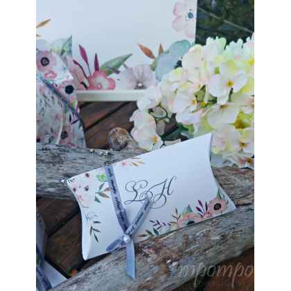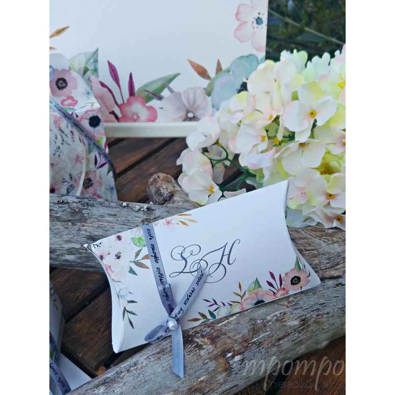 Μπομπονιέρα γάμου κουτάκι σχήμα μαξιλαράκι φλοράλ με τα αρχικά του ζευγαριού