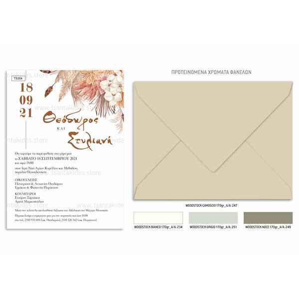 Το προσκλητήριο διαθέτει φάκελο διάστασης 19,5x14,5cm σε χαρτί της επιλογής σας από τους αναγραφόμενους κωδικούς.