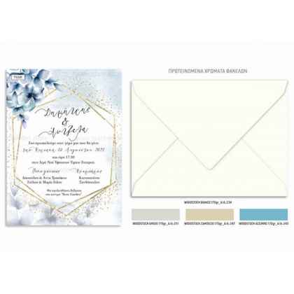 Το προσκλητήριο διαθέτει φάκελο διάστασης 19,5x14,5cm σε χαρτί της επιλογής σας από τους αναγραφόμενους κωδικούς.