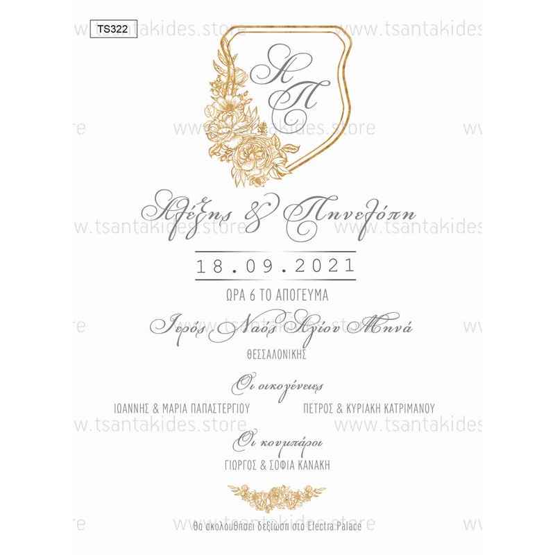 Προσκλητήριο γάμου με χρυσό λογότυπο και μονογράμματα.