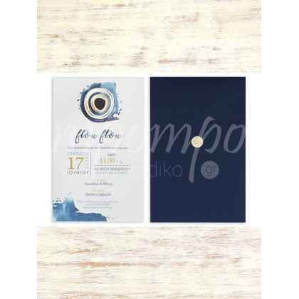 Η κάρτα του προσκλητηρίου είναι εκτυπωμένη σε λευκό περλέ χαρτί 300gr και συνδυάζει εκτύπωση και χρυσοτυπία στο ματάκι.