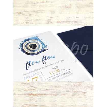 Προσκλητήριο βάπτισης για αγόρι με θέμα το ματάκι σε μπλε αποχρώσεις.