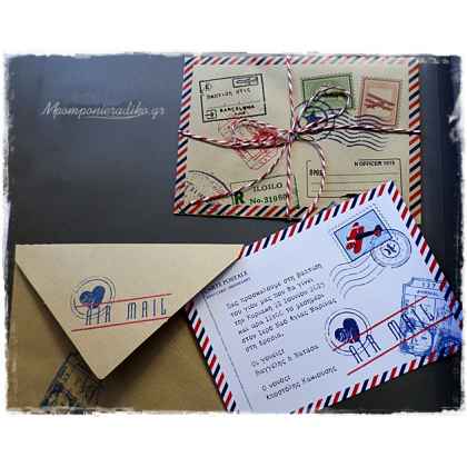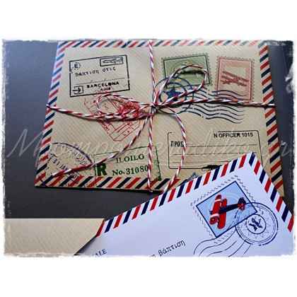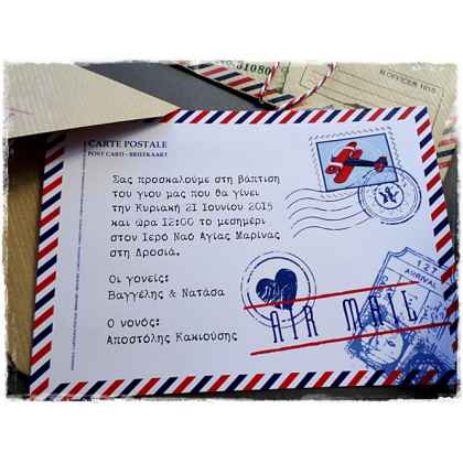 Προσκλητήριο βάπτισης αεροπλάνο post card με τυπωμένο φάκελο .