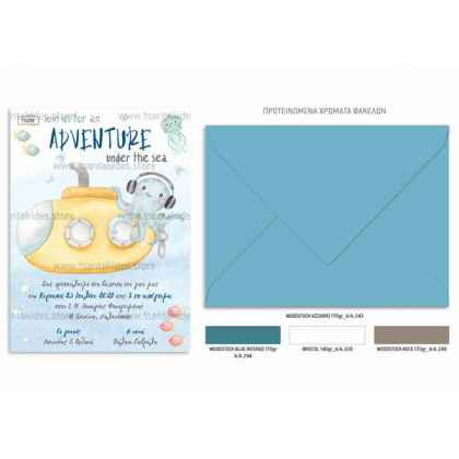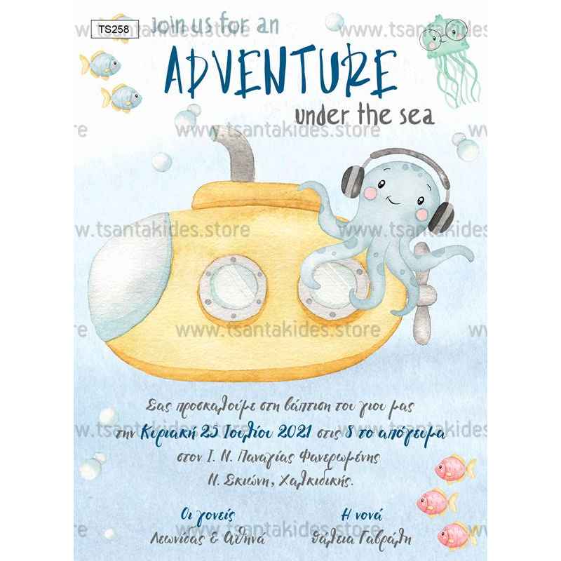 Προσκλητήριο βάπτισης για αγόρι με θέμα το υποβρύχιο και το μικρό χταπόδι.