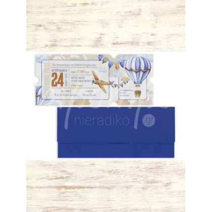 Προσκλητήριο βάπτισης για αγόρι με θέμα το ταξίδι, το αερόστατο και το αεροπλανάκι.