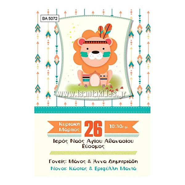 Προσκλητήριο βάπτισης με θέμα Ζωάκια Ινδιάνου