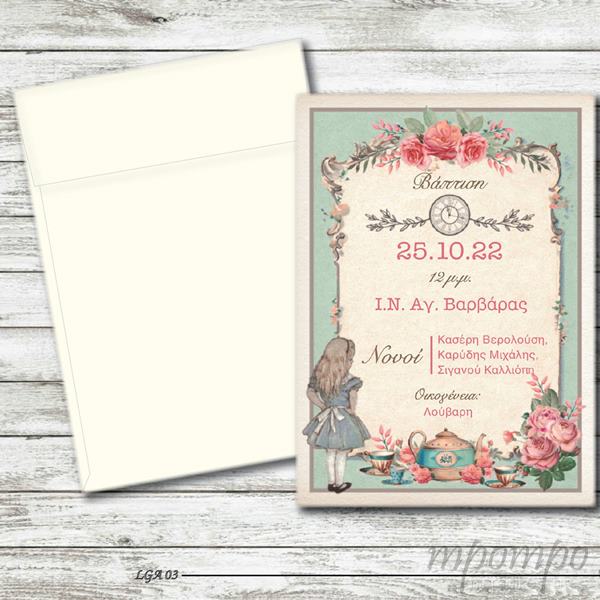 Προσκλητήριο βάπτισης για κορίτσι με θέμα την Αλίκη στην χώρα των θαυμάτων !