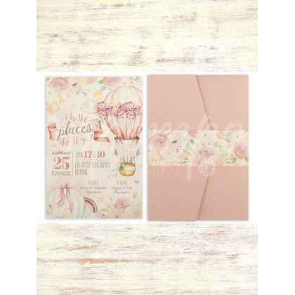 Προσκλητήριο βάπτισης για κορίτσι με θέμα το αερόστατο σε dusty pink αποχρώσεις και floral μοτίβο.