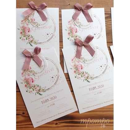 Προσκλητήριο βάπτισης ρομαντικό με κύκλο διακοσμημένος με λουλούδια και όνομα του παιδιού