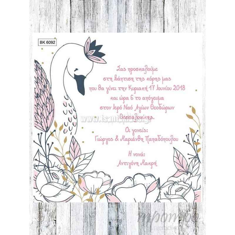 Προσκλητήριο βάπτισης με φάκελο για κορίτσι με θέμα τον κύκνο