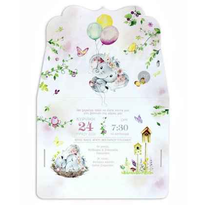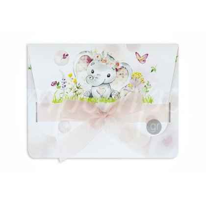 Προσκλητήριο βάπτισης για κορίτσι με θέμα το μικρό ελεφαντάκι σε ροζ παστέλ αποχρώσεις.