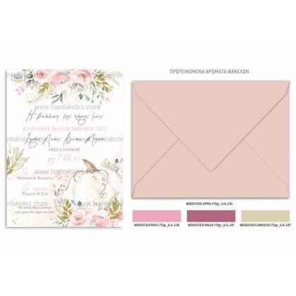 Το προσκλητήριο διαθέτει φάκελο διάστασης 19,5x14,5cm σε χαρτί της επιλογής σας από τους αναγραφόμενους κωδικούς.