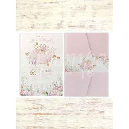 Προσκλητήριο βάπτισης για κορίτσι με θέμα την μικρή κολοκύθα σε ροζ παστέλ αποχρώσεις με φλοράλ μοτίβο.