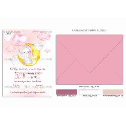 Προσκλητήριο βάπτισης για κορίτσι με θέμα το μικρό ελεφαντάκι στο φεγγάρι.