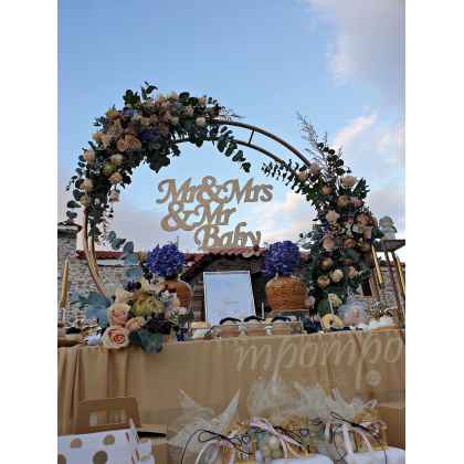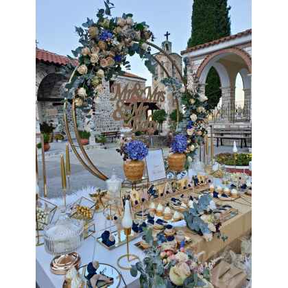 μεταλλικό κύκλο στο κέντρο του τραπεζιού στολισμένο με εντυπωσιακές συνθέσεις από φυσικό λουλούδι !!