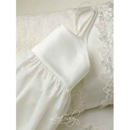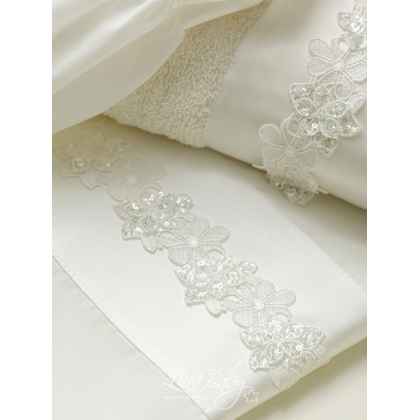 Ο στολισμός με φάσα από σατέν silky ντουσέζ συνδυάζεται αρμονικά με φλοράλ τρέσα διακοσμημένη με διάφανες παγιέτες, χαρίζοντας φίνα λάμψη και αέρινη κίνηση στο σύνολο.