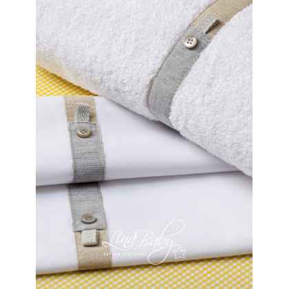 Μοντέρνο βαμβακερό σετ λαδόπανων σε λευκό, με κομψές τρέσες σε μπεζ & γκρι αποχρώσεις και δίχρωμα κουμπάκια που προσθέτουν χαρακτήρα στο design.
