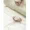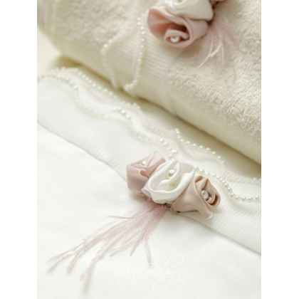 Τα χειροποίητα λουλούδια από ύφασμα σε τρεις απαλές αποχρώσεις — μπεζ, σάπιο μήλο και εκρού — μαζί με τα αέρινα φτερά, προσθέτουν μοναδικές πινελιές χρώματος και ρομαντισμού.