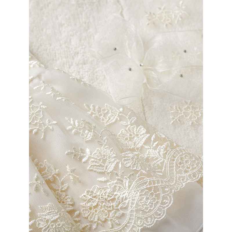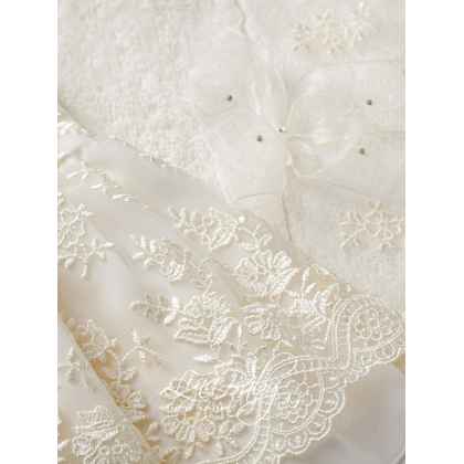 Βαμβακερό σετ λαδόπανου σε λευκό & ιβουάρ, διακοσμημένο με εντυπωσιακή Γαλλική δαντέλα και φίνο φιόγκο από οργαντίνα με στρας τύπου Swarovski