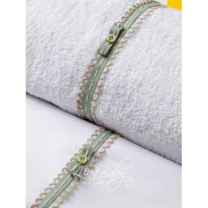 Βαμβακερό σετ λαδόπανων σε λευκό χρώμα με ιδιαίτερη τρέσα από ζικ-ζακ κορδόνια στο χρώμα του σπάγκου και έξτρα τρέσα στο χρώμα της μέντας.