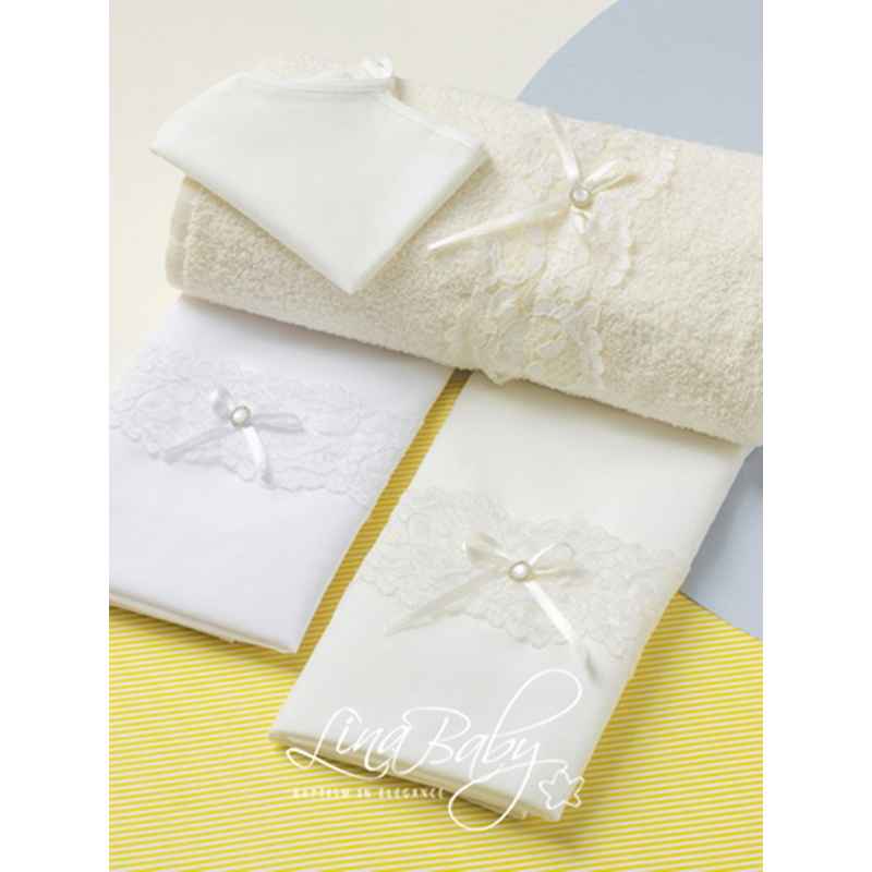 Απόλυτη κομψότητα σε κάθε λεπτομέρεια: βαμβακερό σετ σε λευκό & εκρού, διακοσμημένο με φαρδιά δαντέλα κορδονέ, σατέν φιογκάκι και εμβληματικό κουμπάκι με στρας & πέρλα.
