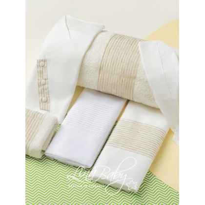 Εξαιρετικό βαμβακερό σετ λαδόπανων σε λευκό και εκρού, με φαρδιά φάσα από φίνα ριγέ οργαντίνα στους ίδιους απαλούς τόνους της βάσης.