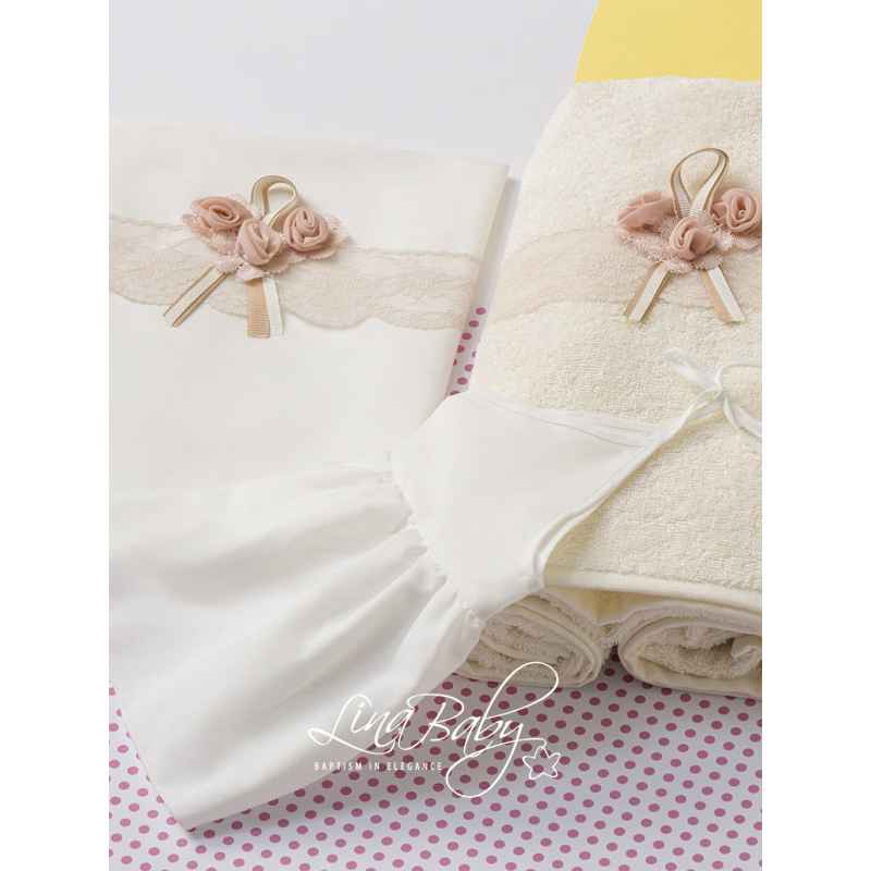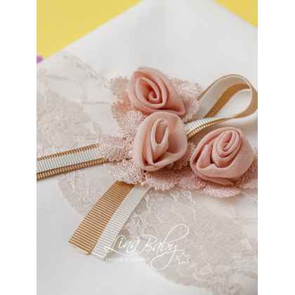Η γαλλική δαντέλα σε τόνους πούδρας και τα απλικέ λουλούδια, συνδυάζονται μοναδικά δημιουργώντας ένα χειροποίητο μπουκέτο που ξεχωρίζει σε κάθε βάπτιση.