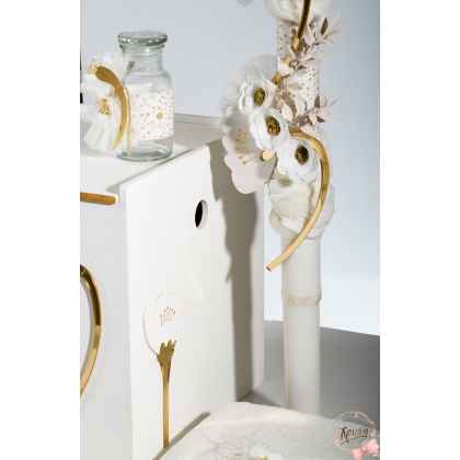 Κύβος ξύλινος ( Διαστάσεις 35cm Χ 35cm) και λαμπάδα βάπτισης ανάλογα στολισμένα.