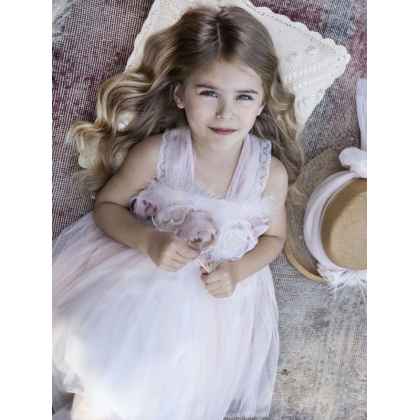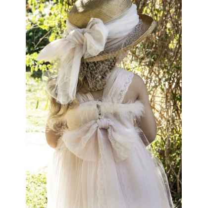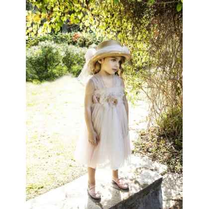 Ρομαντικό φόρεμα βάπτισης Baby Bloom σε σομόν απόχρωση με ιδιαίτερη ανάγλυφη δανδέλα στο τελείωμα της φούστας και στους ώμους , χειροποίητα πλούσια λουλούδια που στολίζουν το μπούστο .Πλούσια τούλινη φούστα στην ίδια απόχρωση και εσωτερική επένδυση από μαλακό βαμβακερό ύφασμα . Ασορτί κορδέλα με τα ίδια λουλούδια του φορέματος και κατ’ επιλογή μπαντάνα ή τουρμπάνι .