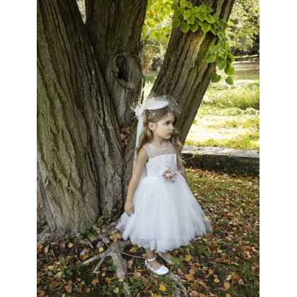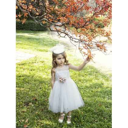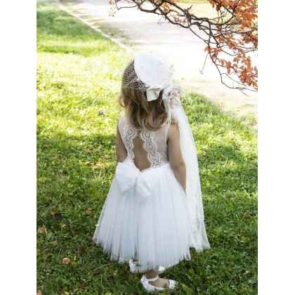 Ρομαντικό τούλινο φόρεμα Baby Bloom της συλλογής Printemps 2023 σε ιβουάρ απόχρωση που το χαρακτηρίζει μια ανάγλυφη βαμβακερή δανδέλα στο μπούστο και στη πλάτη του φορέματος σχηματίζοντας V . Αέρινη φούστα με τελείωμα απο την ίδια δανδέλα . Η εσωτερική επένδυση του φορέματος αποτελείται από μαλακό βαμβακερό ύφασμα.