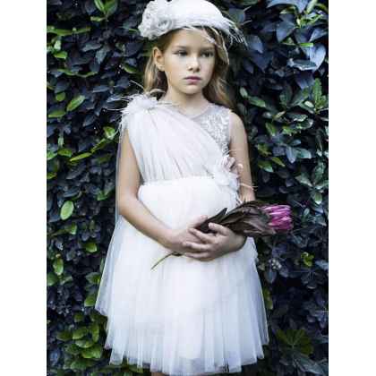 Ρομαντικό φόρεμα βάπτισης Baby Bloom της συλλογής Printemps 2023 σε σομόν απόχρωση που το χαρακτηρίζει η διακριτική λάμψη του απο τούλι με διάφανο γκλίτερ και δανδέλα . Ιδαίτερο μπούστο με διαφάνεια , κρυσταλλάκια και χειροποίητα λουλούδια στον ώμο και τη μέση. Η εσωτερική επένδυση του φορέματος αποτελείται από μαλακό βαμβακερό ύφασμα.