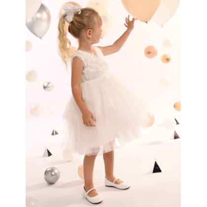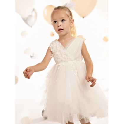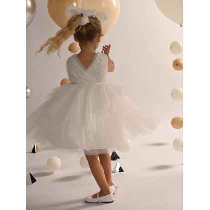 Ένα πανέμορφο φόρεμα σε off white χρώμα, με κρουαζέ ντραπαριστό μπούστο από μαλακό τούλι και τούλι με glitter, που αποπνέει λάμψη και κομψότητα.