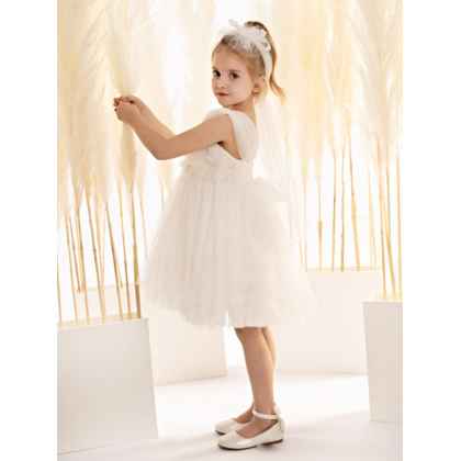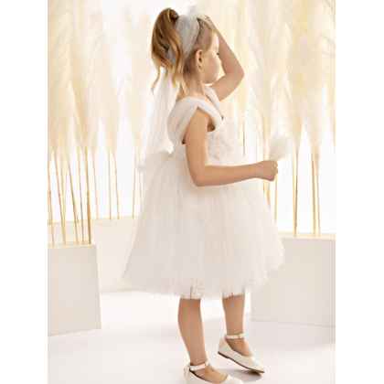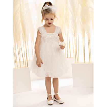 Οι φαρδιές τιράντες από ντραπέ τούλι προσδίδουν μια αίσθηση ρομαντικότητας, ενώ η φούστα από δαντέλα «Chantilly” και μαλακό τούλι, αναδεικνύει την ελαφρότητα και την κομψότητα του ρούχου με μια αρμονική αντίθεση στα υλικά, ιδανικό για μια ξεχωριστή περίσταση.