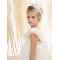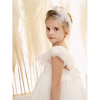 Αυτό το φόρεμα σε off white χρώμα από φίνα πανέμορφη πουά δαντέλα αποτυπώνει με χάρη τη ρομαντική κομψότητα και ταυτόχρονα το μοναδικό design. Η πλούσια φούστα καταλήγει σε εντυπωσιακά τελειώματα από “γλώσσες” δαντέλας, αναδεικνύοντας την πολυτέλεια του υφάσματος ενώ το μπούστο είναι φτιαγμένο από ντουμπλαρισμένη δαντέλα με ντουσέζ. Τα πλούσια βολάν στα μανίκια από μαλακό τούλι συνεχίζονται και ενώνονται αρμονικά στην πλάτη με τις ντελικάτες ντραπέ τιράντες δημιουργώντας μια εντυπωσιακή πλάτη. Στη μέση, μια αέρινη ζώνη από απαλό τούλι αγκαλιάζει τη σιλουέτα, χαρίζοντας αρμονία και ισορροπία στο σχέδιο. Η ρομαντική αισθητική ολοκληρώνεται με μια εκλεπτυσμένη κορδέλα για τα μαλλιά, στολισμένη με έναν εντυπωσιακό τούλινο φιόγκο, αέρινα φτερά και ένα χειροποίητο λουλούδι, συνθέτοντας μια εμφάνιση που μοιάζει βγαλμένη από τα παραμύθια.