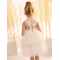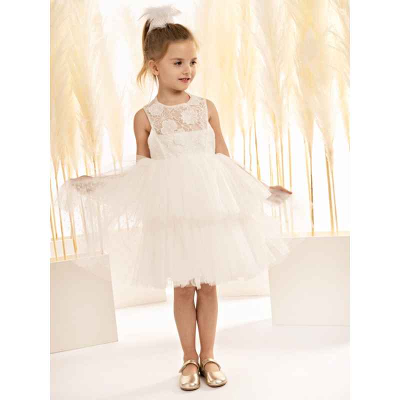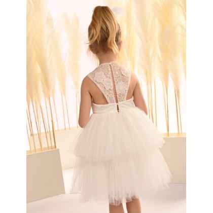 Ένα φόρεμα που μοιάζει να έχει ξεπηδήσει από τις σελίδες ενός παραμυθιού! Σε εκρού απόχρωση, φτιαγμένο από υπέροχη κεντητή οργαντίνα με απλικέ λουλούδια και αέρινο πουά κεντητό τούλι. Το μπούστο με την εντυπωσιακή πλάτη, παίζει αρμονικά με τα κοψίματα, τις διαφάνειες και τις υφές, δημιουργώντας μια αέρινη αίσθηση και υπέροχα σχεδιαστικά σχήματα. Η φούστα σαν tutu μπαλαρίνας, είναι πλούσια και εντυπωσιακή, με διπλό βολάν από κεντημένο πουά τούλι, προσθέτοντας όγκο, χάρη και κίνηση σε κάθε βήμα. Το σύνολο ολοκληρώνεται με μια ρομαντική κορδέλα για τα μαλλιά, διακοσμημένη με φιόγκο από τούλι και αέρινα φτερά.