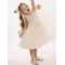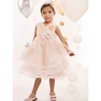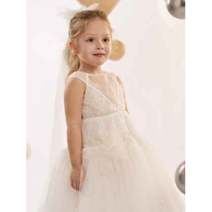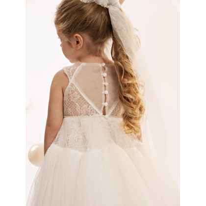 Ένα πανέμορφο χειροποίητο λουλούδι κοσμεί την φούστα χαρίζοντας μια ρομαντική πινελιά σε όλο το φόρεμα, ενώ το ίδιο λουλούδι στολίζει και την κορδέλα των μαλλιών ολοκληρώνοντας την ονειρική εικόνα.