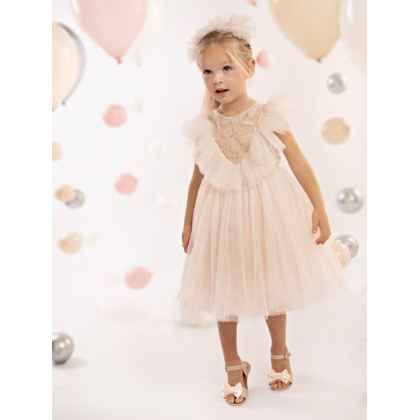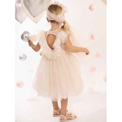 ολοκληρώνεται με κορδέλα μαλλιών διακοσμημένη με πλούσιο τούλινο βολάν. Όλα τα