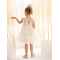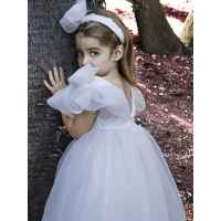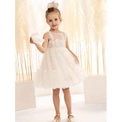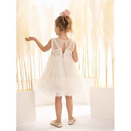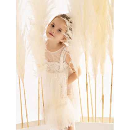 Η σουρωτή φούστα, από πουά κεντητό τούλι με φαρδύ βολάν στο τελείωμα, προσφέρει πλούσιο όγκο και ζωντανή κίνηση, ενώ η κορδέλα για τα μαλλιά στολίζεται με δύο χειροποίητα λουλούδια σε αποχρώσεις σάπιου μήλου και μπεζ ολοκληρώνοντας την ονειρική εικόνα.