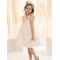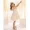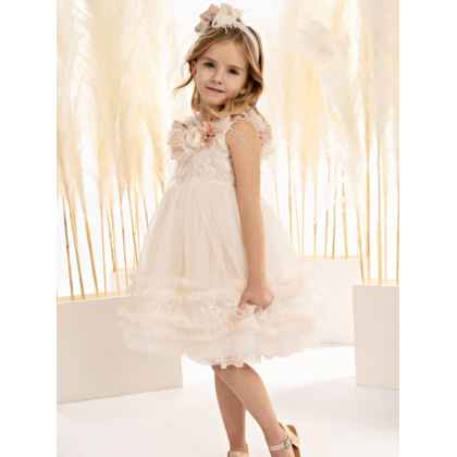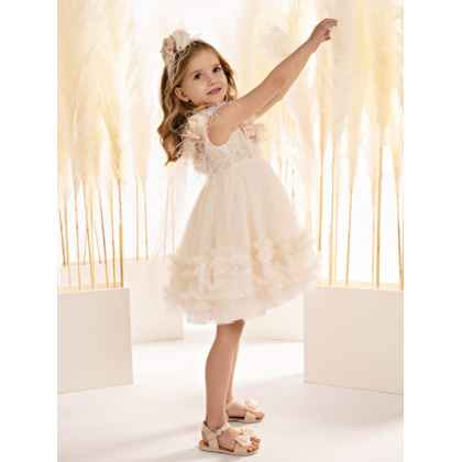 Η φούστα, με την πλούσια σούρα από απαλό τούλι και δαντέλα, κινείται με χάρη και ελαφρότητα, ενώ μια σειρά από μικρά βολάν προσθέτει μια παιχνιδιάρικη, ρομαντική πινελιά.