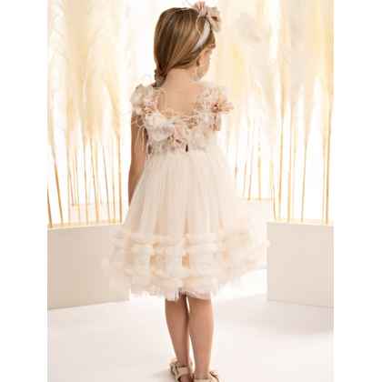 Η εμφάνιση ολοκληρώνεται με κορδέλα για τα μαλλιά, διακοσμημένη με τα ίδια φίνα λουλούδια και φτερά, συνθέτοντας ένα σύνολο που θυμίζει παραμυθένιο όνειρο.