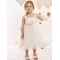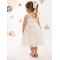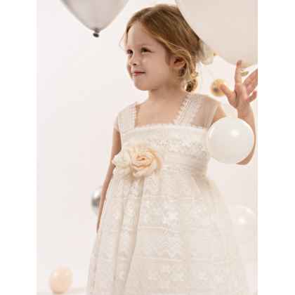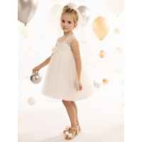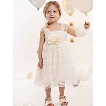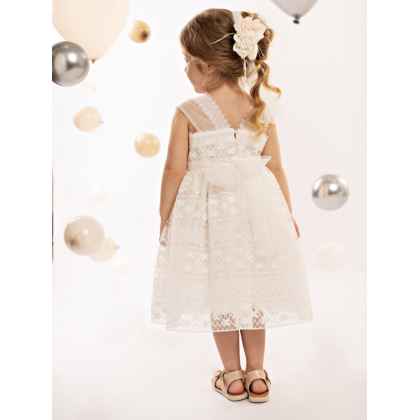 Ένα ονειρεμένο αμπίρ φόρεμα σε λευκό χρώμα, με μπούστο φτιαγμένο από δαντέλα και φαρδιές τιράντες από micro πουά τούλι. Η φούστα με πλούσιες σούρες από δαντέλα και glitter τούλι χαρίζει αέρινη κίνηση και λάμψη. Η ζώνη από τούλι, που δένει πίσω, στολίζεται υπέροχα με δύο χειροποίητα διακοσμητικά τριαντάφυλλα από σατέν σε ροζ και εκρού χρώμα, προσθέτοντας μια ρομαντική πινελιά τόσο στο φόρεμα όσο και στην ασορτί κορδέλα μαλλιών. Όλα τα φορέματα διαθέτουν βαμβακερή φόδρα και φουρό.τα φορέματα έχουν βαμβακερή φόδρα και φουρό.
