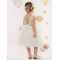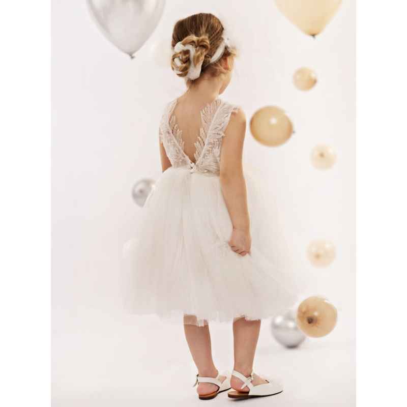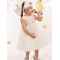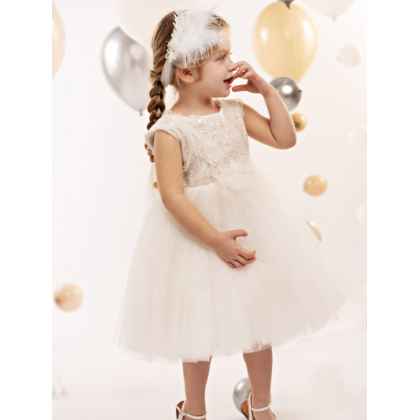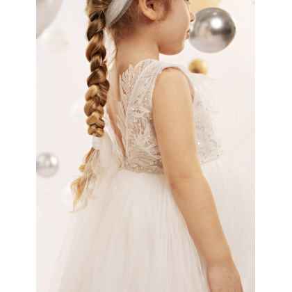 Ένα παραμυθένιο και αέρινο φόρεμα, φτιαγμένο εξ ολοκλήρου από μαλακό τούλι σε off white χρώμα, που αποπνέει φινέτσα και μια εύθραυστη, ονειρική ομορφιά. Το ντραπεριστό μπούστο, ντουμπλαρισμένο με τούλι που έχει κεντημένο πάνω του διάφανες παγιέτες, χαρίζει διακριτική λάμψη, ενώ η ασύμμετρη διακόσμηση από κεντημένα απλικέ φτερά παγονιού δημιουργεί μια μοναδική υφή. Η πλάτη, με εντυπωσιακό άνοιγμα, στολίζεται επίσης με τα περίτεχνα κεντημένα φτερά παγονιού, προσθέτοντας μια νότα θεατρικότητας και υψηλής αισθητικής. Η φούστα, πλούσια και αέρινη, αποτελείται από πολλαπλές στρώσεις μαλακού τούλι, χαρίζοντας υπέροχη κίνηση, ενώ η διακριτική διακόσμηση με στρας στη μέση προσθέτει μια λεπτή πινελιά λάμψης. Το σύνολο ολοκληρώνεται με μια κομψή κορδέλα μαλλιών, διακοσμημένη με τα κεντημένα απλικέ φτερά παγονιού αλλά και αληθινά φτερά, Όλα τα φορέματα διαθέτουν βαμβακερή φόδρα και φουρό.Ένα ονειρεμένο αμπίρ φόρεμα σε λευκό χρώμα, με μπούστο φτιαγμένο από δαντέλα και φαρδιές τιράντες από micro πουά τούλι. Η φούστα με πλούσιες σούρες από δαντέλα και glitter τούλι χαρίζει αέρινη κίνηση και λάμψη. Η ζώνη από τούλι, που δένει πίσω, στολίζεται υπέροχα με δύο χειροποίητα διακοσμητικά τριαντάφυλλα από σατέν σε ροζ και εκρού χρώμα, προσθέτοντας μια ρομαντική πινελιά τόσο στο φόρεμα όσο και στην ασορτί κορδέλα μαλλιών. Όλα τα φορέματα διαθέτουν βαμβακερή φόδρα και φουρό.τα φορέματα έχουν βαμβακερή φόδρα και φουρό.