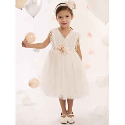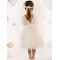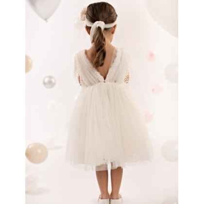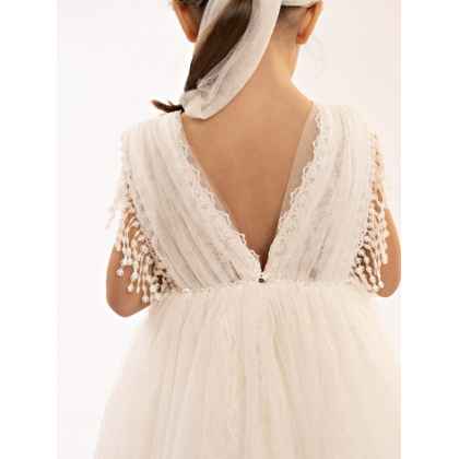 Ένα υπέροχο φόρεμα σε off white χρώμα, φτιαγμένο από μαλακό τούλι και δαντέλα που συνδυάζει την κομψότητα και την ρομαντική παιχνιδιάρικη διάθεση. Το κρουαζέ μπούστο από τούλι στολίζει μοναδικά η τρέσα με τα κρόσσια, ενώ η φούστα με τις πολλές στρώσεις από δαντέλα και τούλι, προσδίδουν όγκο και κίνηση στο φόρεμα. Δύο χειροποίητα τριαντάφυλλα σε ροζ και εκρού αποχρώσεις κοσμούν το μπούστο και την κορδέλα για τα μαλλιά, χαρίζοντας στο σύνολο μια αίσθηση φινέτσας και αρμονίας.