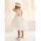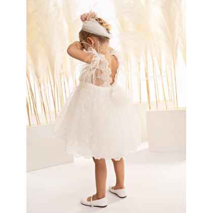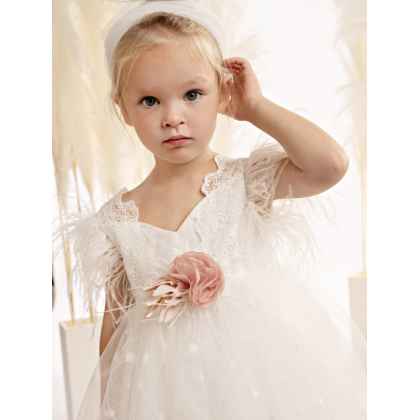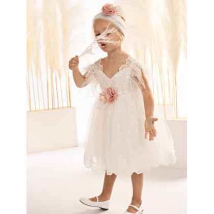 Σε off white χρώμα, αυτό το φόρεμα φτιαγμένο εξολοκλήρου από φίνα δαντέλα ξεχωρίζει για την εκλεπτυσμένη αισθητική του,. Το μπούστο, σε γραμμή καρδιάς από βαμβακερό ύφασμα δένει αρμονικά με την δαντέλα που αγκαλιάζει τους ώμους και συνεχίζει στο πίσω μέρος, δημιουργώντας μια εντυπωσιακή διάφανη ανοιχτή πλάτη που μαγνητίζει τα βλέμματα. Στην θέση των μανικιών, αέρινα φτερά προσθέτουν μια ανάλαφρη, παραμυθένια αίσθηση. Η φούστα, με πλούσιες σούρες από δαντέλα, χαρίζει όγκο και κίνηση, ενισχύοντας τη ρομαντική φύση του σχεδίου. Η εμφάνιση ολοκληρώνεται με ντελικάτα χειροποίητα λουλούδια σε απαλές ροζ και μπεζ αποχρώσεις, που στολίζουν το μπούστο, ενώ μια κομψή κορδέλα για τα μαλλιά, διακοσμημένη με τα ίδια λουλουδάτα μοτίβα, προσθέτει την τελευταία πινελιά σε αυτήν την ονειρική δημιουργία. Όλα τα φορέματα διαθέτουν βαμβακερή φόδρα και φουρό