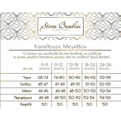 Η νέα trendy πρόταση της Stova Bambini, ένα υπέροχο σύνολο βάπτισης με τα πιο δροσερά βαμβακερά υφάσματα, διατίθεται σε μοναδικό συνδυασμό μπλε-γκρι. Το γιλέκο κατασκευασμένο από εξαιρετικής ποιότητας βαμβάκι με ένα διακριτικό ανάγλυφο στην ύφανση, συνδυασμένο με λευκό βαμβακερό πουκάμισο, ενώ το σύνολο ολοκληρώνεται από το νέο σχέδιο παντελόνι Stova με λεπτομέρεια στο πίσω μέρος. Το σετ αποτελείται από 6 τεμ (γιλέκο, πουκάμισο, παντελόνι, ζώνη, καπέλο και διακοσμητική pochette) και μπορεί να συνδυαστεί άψογα με ασορτί χειροποίητα ανατομικά παπούτσια. Όλα τα υφάσματα των ρούχων είναι από υποαλλεργικό βαμβάκι 100% ή σύμμεικτα υποαλλεργικά υφάσματα. Σχεδιάστε τη βάπτιση των ονείρων σας, κάθε ρούχο συνδυάζεται με ανάλογο φιόγκο για το κουτί ή την βαλίτσα σας, λαμπάδα, λαδόπανα, εσώρουχα, πετσέτες και σετ κολυμπήθρας (κεράκια-σαπούνι-μπουκάλι λαδιού), είτε διακοσμημένο και με το θέμα της επιλογής σας. Μέγεθος από 6 έως 36 μηνών, διαθέσιμο μεγεθολόγιο με διαστάσεις μωρού.