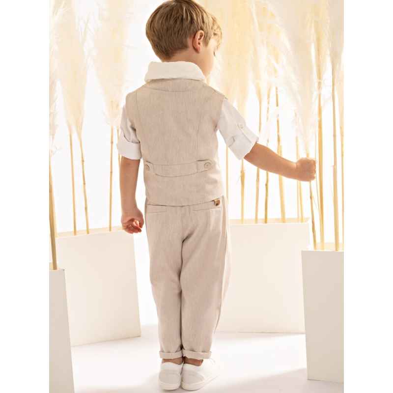 Αυτό το σύνολο ξεχωρίζει για τη μοναδική του αισθητική και το ξεχωριστό του design. Baggy παντελόνι με ιδιαίτερες reverse πιέτες και σταυρωτό γιλέκο με γιακά κιμονό, φτιαγμένα από μπεζ τεχνικό ντραπαριστό ύφασμα. Το βαμβακερό πουκάμισο σε off white απόχρωση διαθέτει έναν ιδιαίτερο mao γιακά, ολοκληρώνοντας την κομψή εμφάνιση. Ιδανικά συνδυάζεται με φουλάρι από βαμβακερή υφαντή γάζα σε off white απόχρωση, ζώνη από υφαντό ιμάντα και ψάθινο καπέλο ή τραγιάσκα, ανάλογα με το στιλ που προτιμάτε.