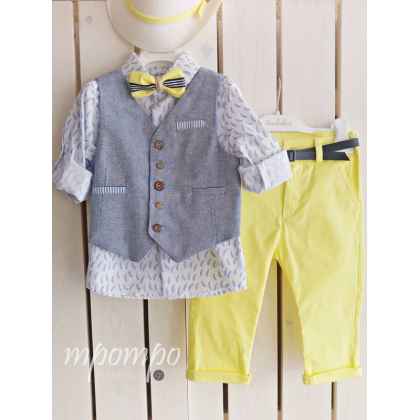 Βαπτιστικό ρούχο bambolino για αγόρι με γιλέκο, κίτρινο παντελόνι, πουκάμισο με γαλάζια φτερά, παπιγιόν, ζώνη & ασορτί ψάθινο καβουράκι με μοναδικές λεπτομέρειες και εξαιρετική ποιότητα υφασμάτων και ραφής.