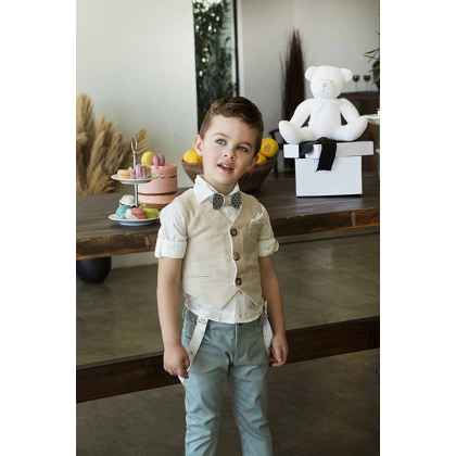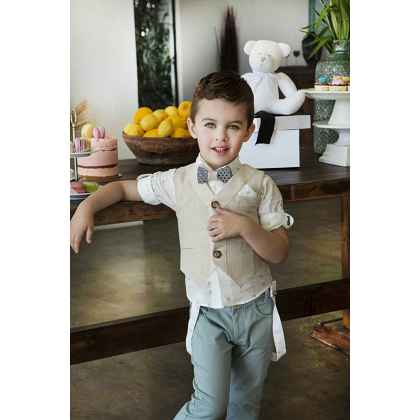 Ολοκληρώνεται με λινό μπεζ γιλέκο με εκρού βαμβακερό τελείωμα.