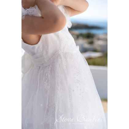 Εντυπωσιακό φόρεμα με υπέροχο, διακοσμητικό βολάν από τρισδιάστατη, χειροποίητη, γαλλική δαντέλα στο μανίκι και φίνα γαλλική κεντημένη δαντέλα με φύλλα και μικρά, αραχνοΰφαντα κλαδιά και λουλούδια σε ίσια γραμμή. Εσωτερικά υπάρχει βαμβακερή, υποαλλεργική φόδρα και υποαλλεργικό βαμβακερό τούλι. Το σύνολο ολοκληρώνεται με χειροποίητο στεφανάκι μαλλιών και διακοσμητικό λουλουδάκι με πούπουλο. Συνδυάζεται τέλεια με μπαλαρίνες με πέρλες ή πέδιλα Stova Bambini. Σχεδιάστε τη βάπτιση των ονείρων σας, κάθε ρούχο συνδυάζεται με ανάλογο φιόγκο για το κουτί ή την βαλίτσα σας, λαμπάδα, λαδόπανα, εσώρουχα, πετσέτες και σετ κολυμπήθρας (κεράκια-σαπούνι-μπουκάλι λαδιού), είτε διακοσμημένο και με το θέμα της επιλογής σας.