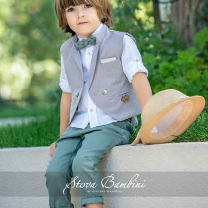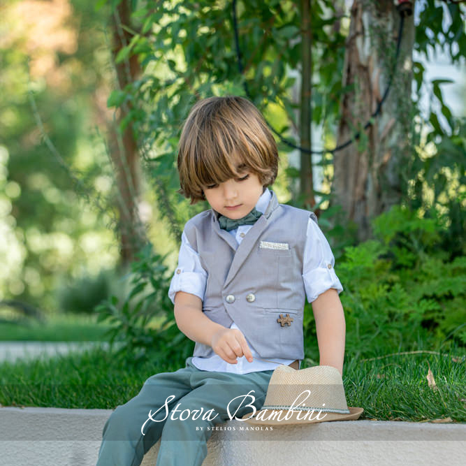Ένας chic συνδυασμός σε ιδιαίτερες αποχρώσεις, σε ένα σετ βάπτισης 8 τεμαχίων, που περιλαμβάνει το all time classic σχέδιο γιλέκου της Stova Bambini με 2 κουμπάκια. Το σύνολο αποτελείται από μπεζ-καφέ γιλέκο με ιδιαίτερο ανάγλυφο μοτίβο και βαμβακερό μέντα παντελόνι. Το βαμβακερό λευκό πουκάμισο ολοκληρώνει το σύνολο. Διατίθεται με καπέλο, χειροποίητο υφασμάτινο παπιγιόν, ζώνη, διακοσμητική pochette και κρεμαστό αξεσουάρ παντελονιού. Συνδυάζεται με ανατομικά παπούτσια από το ύφασμα του ρούχου. Σχεδιάστε τη βάπτιση των ονείρων σας, κάθε ρούχο συνδυάζεται με ανάλογο φιόγκο για το κουτί ή την βαλίτσα σας, λαμπάδα, λαδόπανα, εσώρουχα, πετσέτες και σετ κολυμπήθρας (κεράκια-σαπούνι-μπουκάλι λαδιού), είτε διακοσμημένο και με το θέμα της επιλογής σας. Μέγεθος από 6 έως 36 μηνών, διαθέσιμο μεγεθολόγιο με διαστάσεις μωρού.